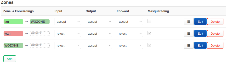 Click on Edit the lan zone and set "Allow forward to destination zones" to WGZONE:WGINTERFACE" as the only option under allowed destinations.