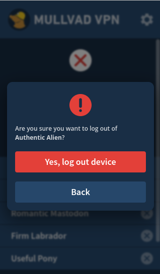 - To be able to log in you will need to remove at least one of the devices, by tapping the X to the right of the device name. To make sure you don't delete a device that you are using, open the Account settings in the Mullvad app on each device to see its device name (if you do not see it then make sure you have updated the app). If you are using WireGuard outside of the Mullvad app then see instructions below.