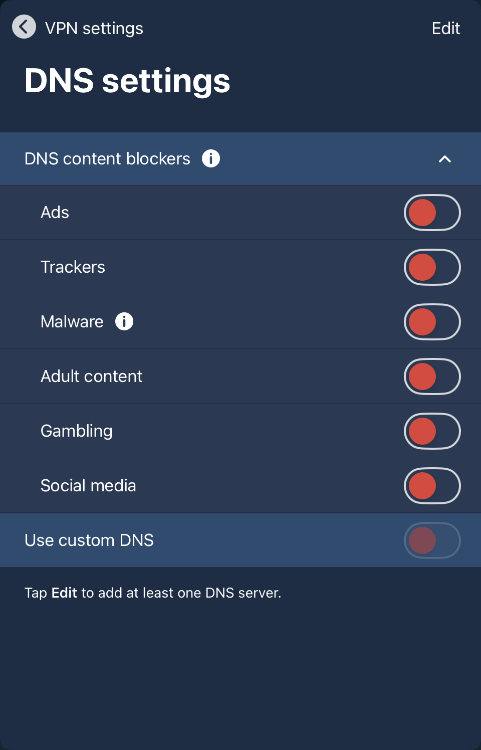 If you enable any of the options (or multiple) then Mullvad will use our filtered DNS server to prevent some content based on the selection from loading in your web browser and other apps. In case you have a problem to load a website you can try to disable this. The filter lists we use are published at our GitHub.